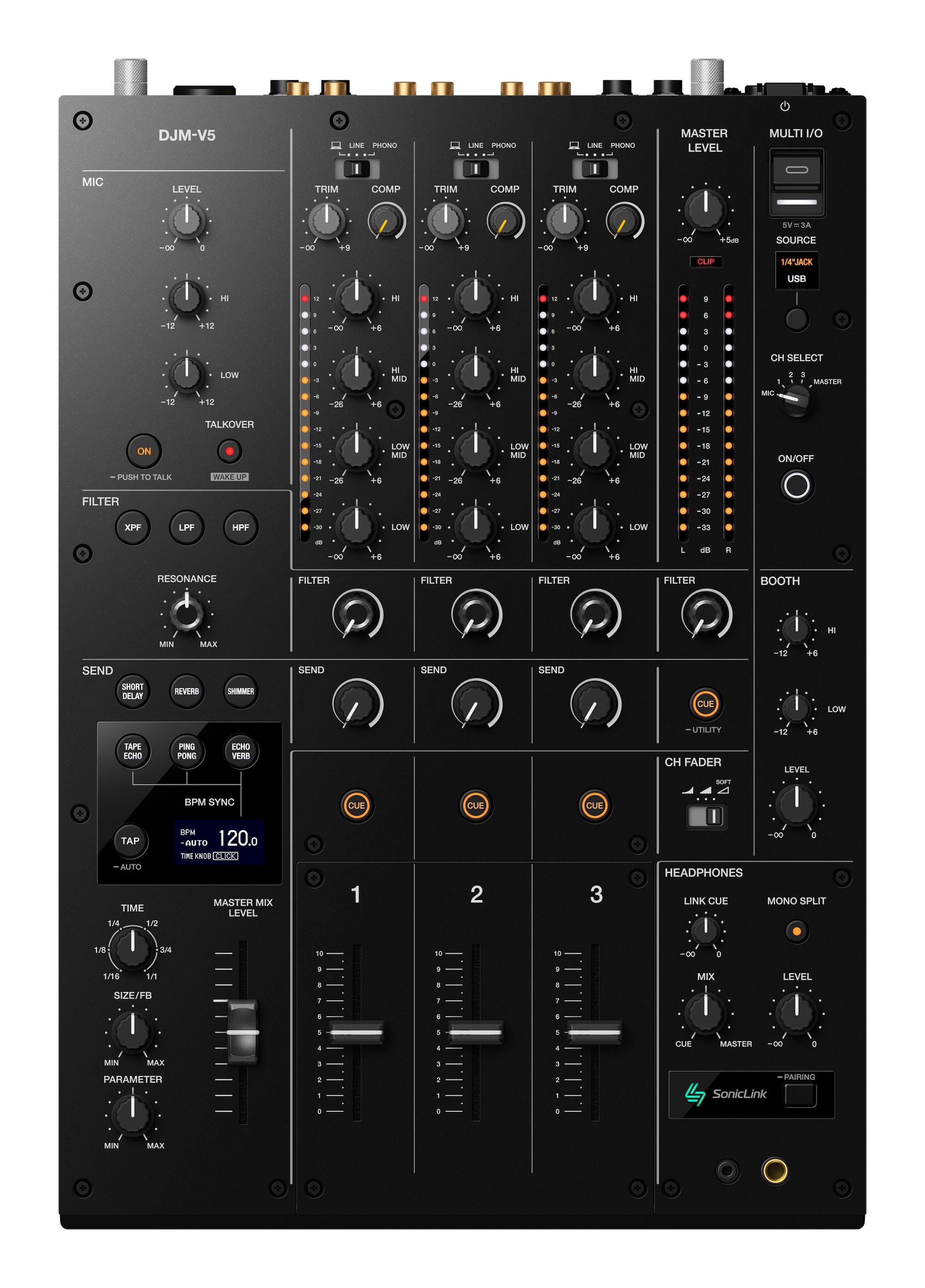 DJM-V5 tiene tres canales y ecualización a cuatro bandas: Hi, Hi Mid, Low Mid y Low, además de filtro por canal y envío y retorno analógico o conexión USB en el Multi I/O, al cual se le puede conectar directamente el nuevo procesador de efectos RMX-Ignite.