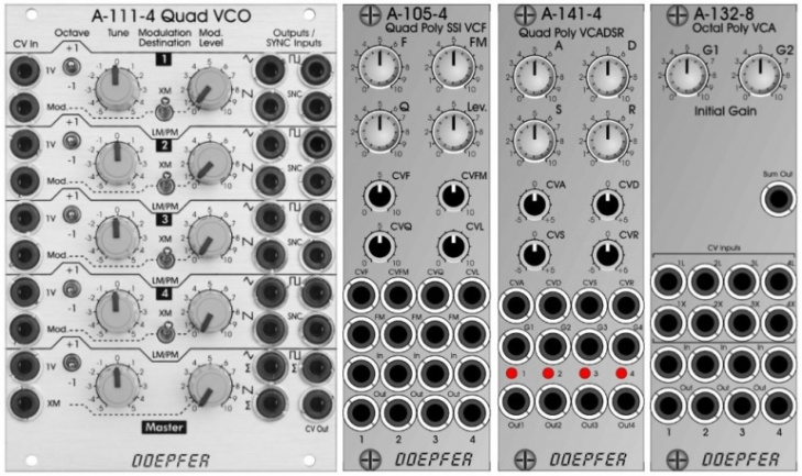 Se trata de un cuádruple filtro (A-105-4), un cuádruple ADSR (A-141-4), y un óctuple VCA (A-132-8), que podrían usarse en lugar de varias unidades de cada tipo y combinarse con el cuádruple VCO A-111-4. La idea es la de facilitar en lo posible la confección de un sistema multivoz a base de controlar con un único juego de potenciómetros los parámetros comunes a las varias unidades presenta módulo. Así, por ejemplo, un único potenciómetro de frecuencia de corte arrastraría simultáneamente a los 4 filtros presentes en A-105-4 ayudando a que sea más sencilla la configuración y uso polifónico.