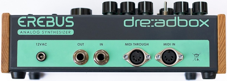 Erebus (539 USD) es un sinte analógico con dos osciladores que admiten uso parafónico, LPF resonante de 12 dB/oct, un LFO que llega a 30Hz (sin profundizar en la región audio), una envolvente ADSR libre y otra simple (sólo AD) dedicada al VCA. Entre los complementos peculiares con los que se adorna ese vestido tan simple, cada oscilador tiene su propio control de 'glide' individual, existe una unidad de delay/eco que admite control por voltaje, y podemos usar la entrada audio para procesar sonido externo. Pese a ser analógico cuenta con interfaz MIDI con 'in' (atiende mensajes de nota, pitch bend y rueda de modulación, y admite canales midi 1-7 o bien modo Omni) y un atípicamente denominado 'through' que, aunque sea correcto inglés, contradice el estándar MIDI de preferir la denominación 'thru'.