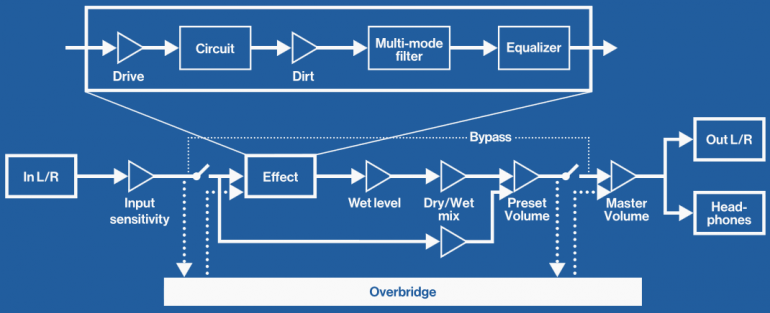 Son 8 tipos de distorsión, más filtrado multimodo (7 respuestas diferentes) resonante y EQ sencilla graves/agudos. Los detalles de los tipos disponibles y las funciones saltan a la vista en la foto de su panel, y respecto a la disposición interna este esquema aclara todo lo necesario: