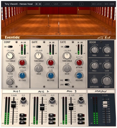 El plugin, llamado Tverb, está inspirado en el sonido de Heroes, clásica canción de Bowie donde Visconti experimenta con varios micrófonos en la sala, que permiten efectos particulares en la voz, nuevas formas de alterar la dinámica, propagar los ecos, es interesante. Además si tenemos en cuenta que la gente de Eventide se propuso capturar y recrear el ambiente del icónico espacio de conciertos Meistersaal, estamos ante un plugin original.