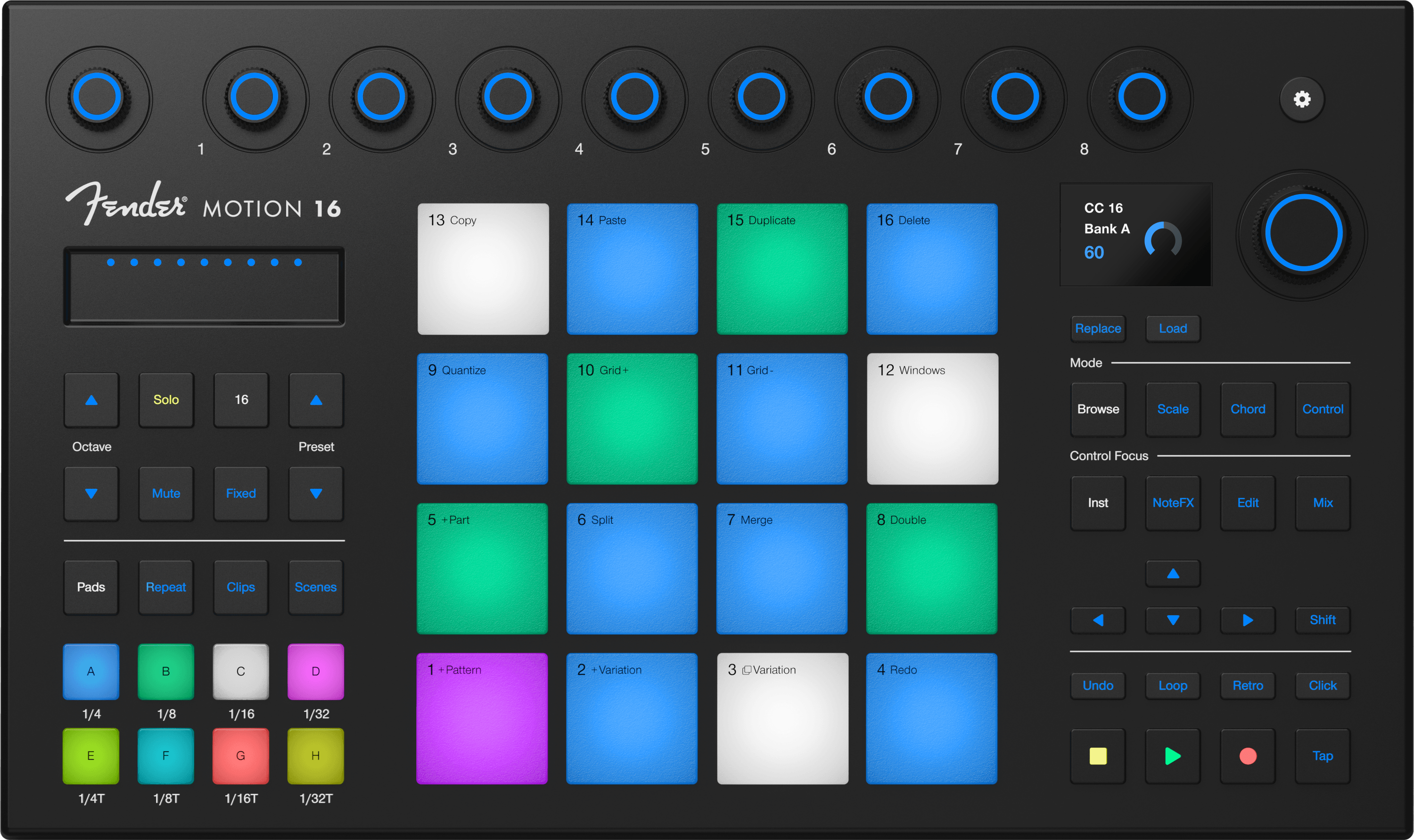 El dispositivo integra, además de los evidentes 16 pads RGB (fabricados por Fatar), nueve knobs y un dial retroiluminados, diseñados para ofrecer control en tiempo real sobre instrumentos y efectos, así como una pantalla a color que proporciona información visual inmediata sobre los parámetros y el estado de la sesión. Fender remarca también que, aunque su integración con Fender Studio Pro es mucho más profunda, Motion 16 funcionará con cualquier DAW. Su precio oficial es de 279€, y su disponibilidad está prevista para la primavera de 2026.