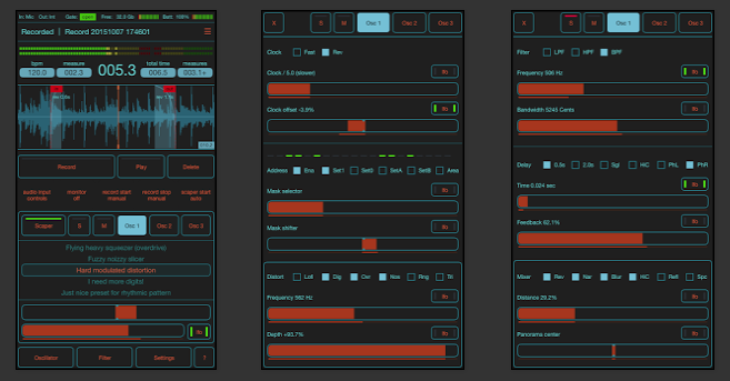 La velocidad de clock del oscilador puede alterarse en un rango amplio con opción de reversa. También se ofrecen dos efectos de distorsión, el primero basado en alterar el sampleo en cuanto tal al estilo del circuit bending, y el segundo basado en lofi, sobre carga, ruido y modulación en anillo, a lo cual se adiciona un LFO individual para variar parámetros de osciladores y filtros. Como funciones extra, tenemos que soporta control MIDI para todo tipo de botones, potenciómetros y deslizadores, pudiendo ser controlada tanto desde herramientas externas como desde otras apps. Para la carga de samples puede utilizarse la red, copiar-pegar, iTunes o ingreso desde otra app. La aplicación cuenta con varios colores de interfaz gráfica y posibilidad de guardar estado en Audiobus.