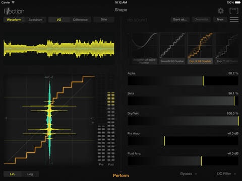 Flection ofrece 30 diseños de curvas de waveshaping diferentes que actúan como distorsión instantánea modificando de forma importante la señal entrante. Las 30 curvas admiten cierto grado de personalización. Muchas de ellas son bien agresivas, por lo que serán más eficaces con señales monofónicas, o en todo caso de escasa complejidad, en las que puedan servir para lograr imponer un carácter importante pero sin caer en el ruidismo. Quizás, puestos a criticar y juzgando sin haber visto en detalle la app (sólo en imágenes / vídeo promocional), parece demasiado centrada en distorsiones simétricas y no llego a observar la presencia de controles que faciliten la asimetría o el desplazamiento de la entrada (que permitiría un resultado de distorsión menos simétrica y por ello más tendente al equilibrio entre armónicos pares e impares).