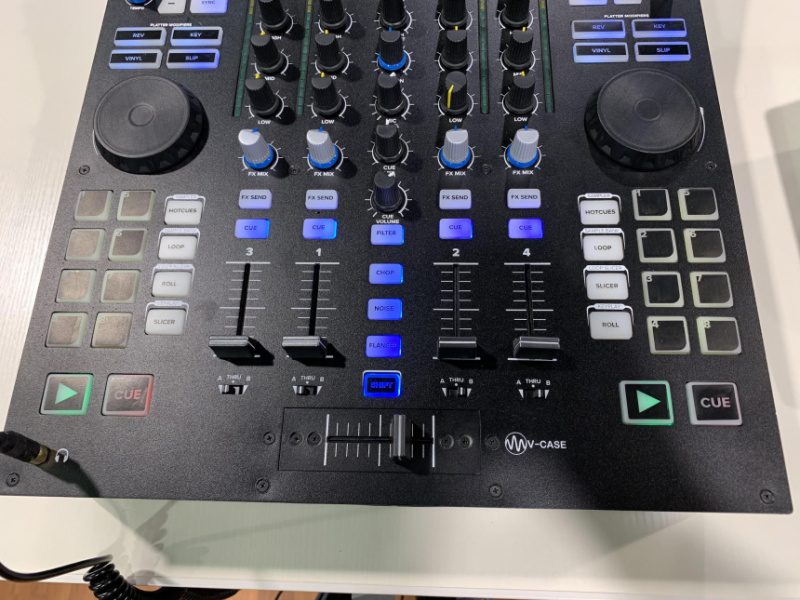 "No es el típico reproductor de gran formato, lo que hemos hecho es tomar el SDJ-4000 y hacerlo más pequeño, hemos reducido las tiras táctiles, jogwheels... esencialmente lo hemos hecho más compacto para DJs de discomóvil, es más portátil y lo puedes llevar a cualquier parte y hacer cualquier cosa. Sigues teniendo un doble reproductor, cuatro canales de audio... Y puede usar dos dispositivos de almacenamiento USB, grabar en uno de ellos, puedes navegar por los archivos, reproducirlos, tienes un filtro, una función de chop, un efecto noise y un flanger en cada deck, puedes hacer búsquedas por tonalidad, puedes usar los hotcues como si fuera un sampler, hacer loops, un slicer para los loops, disparar muestras en diferentes tonalidades –key/tone play–, efecto roll, salida de monitores, controlar los niveles de los micros... me temo que lo tenemos todo cubierto".