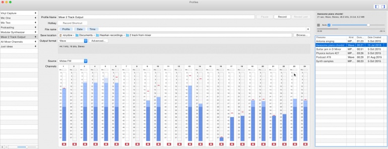 La grabación se puede realizar de forma directa en formato AIFF, WAV, MP3, ALAC y AAC, ofreciendo hasta 32-bit y 96kHz (en los formatos WAV y AIFF). Los archivos se nombran automáticamente según los perfiles de grabación configurados. Faltaría conocer la calidad del material obtenido, pero seguramente será de utilidad para algunos.