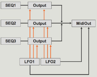 Además de las tres hileras independientes la versión de pago ofrece un par de LFOs MIDI útiles para generar mensajes de control sincronizados con las secuencias y que pueden alterar los valores que estas expulsan.
