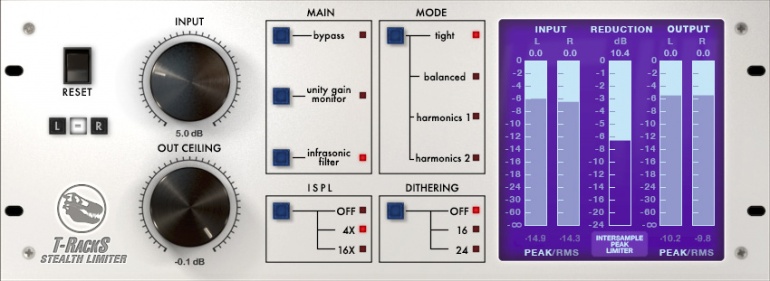 Esto permite que "el audio final convertido casi nunca exceda el limite establecido", lo cual es relevante hoy en día con la variedad de formatos y alteraciones de compresión del material sonoro. Además T-RackS Stealth Limiter integra un filtro infrasónico que permite cortar información de frecuencias sub-graves que puedan de alguna forma afectar la carga de trabajo del limitador.