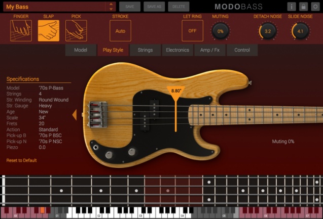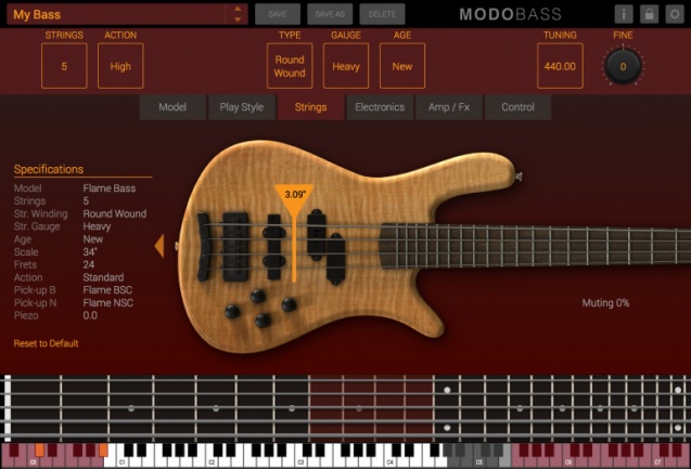 Se puede especificar el número de cuerdas (4 o 5) y sus parámetros tales como calibre, envejecimiento, tipo de construcción (entorchado plano, entorchado redondo, etc.) para poder así definir el timbre y el ‘sustain’. Hay opción de ubicar un diapasón, e incluso de alargar/acortar el propio mástil, o de regular la mayor o menor presencia de sonido de trastes como cuando las cuerdas están a menor o mayor altura respecto al mástil.