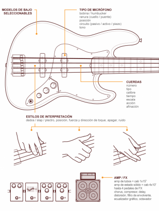 A los 12 modelos de bajo disponibles hay que añadir la elección del tipo de toque: finger, slap, o pick (moviendo la púa hacia arriba, abajo o alternativamente), a los que puede sumarse cuando lo deseemos la acción mute. También seleccionable el punto de ataque a la cuerda, desplazándolo desde el puente al cuello.