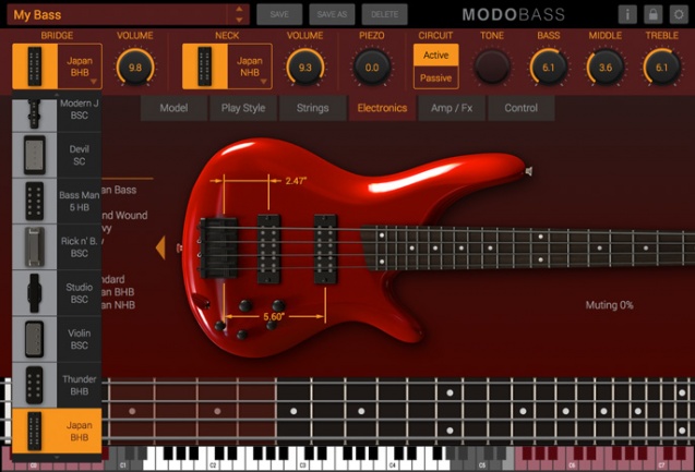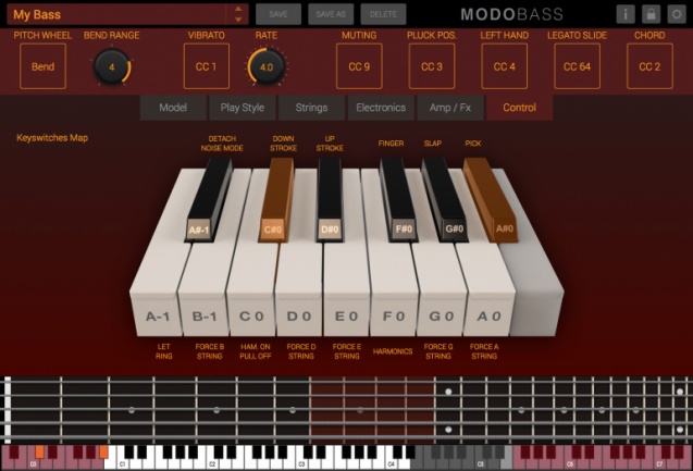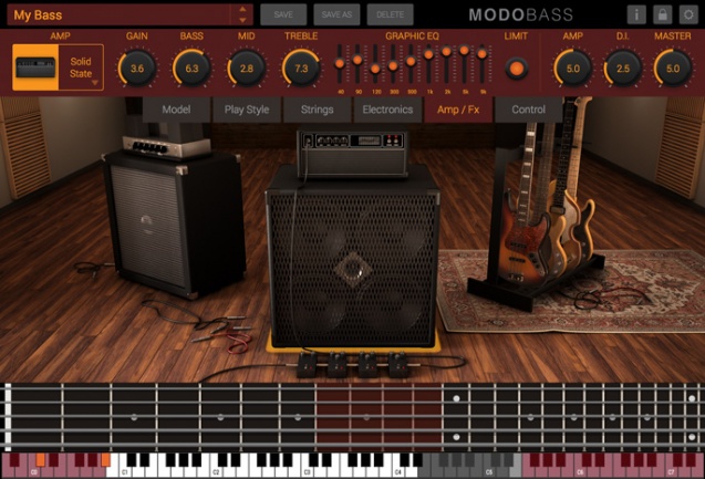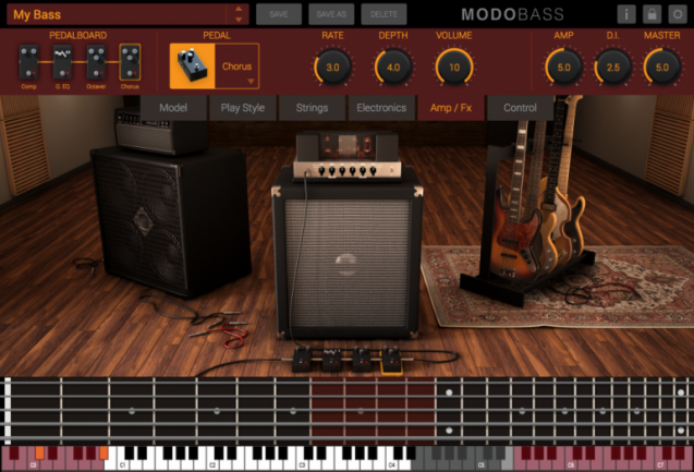 Modo Bass recrea desde modelado digital el proceso completo de interpretación en un bajo. El sonido no parte de muestras, sino de simular la generación, captación, amplificación y tratamiento de 12 modelos de bajos diferentes.