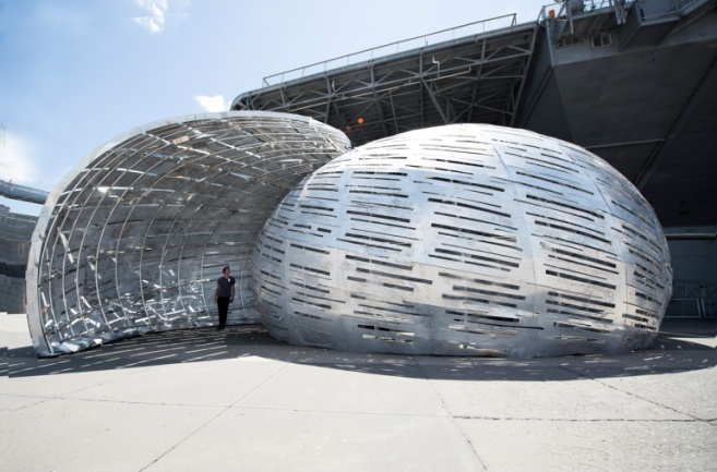 Afuera de un laboratorio de la NASA en Pasadena, California, los arquitectos Jason Kilmoski y Leslie Chang han construido en colaboración con el artista sonoro e ingeniero acústico Shane Myrbeck, una estructura coclear, en espiral, como un caracol, donde es posible ingresa para escuchar sonidos inspirados en 19 satélites en órbita.