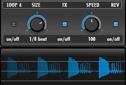 En cada una de las 4 secciones encontramos 3 conmutadores para activar o no el correspondiente loop, invertirlo y aplicarle un efecto básico que puede seleccionarse entre Bit Reducer, Autopan, Hipass and Phaser. También existen dos controles dedicados a definir la duración del loop expresada en figuras musicales como por ejemplo un compás, y a modificar la velocidad de lectura del fragmento capturado.