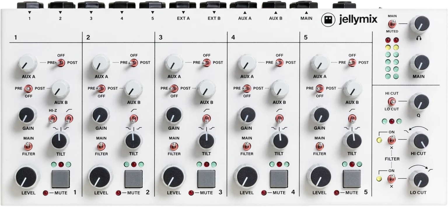Jellymix es, ante todo, un mezclador estéreo pensado para el directo, aunque también se puede usar en el estudio y, según Intellijel, "en el salón de tu casa". Sus cinco canales estéreo aceptan señales balanceadas de línea mediante jacks de 6,3 mm, e botones de mute (sin clic), indicadores LED de nivel y un gran potenciómetro de volumen por canal. El primero de ellos, añade además una entrada Hi‑Z, ideal para guitarras u otros instrumentos que requieran alta impedancia.
