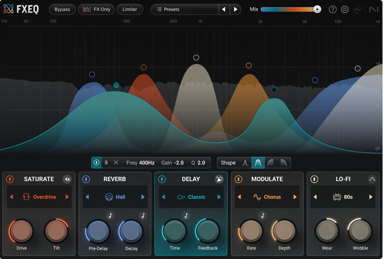 La firma iZotope, conocida por sus herramientas de mezcla y restauración, como el entorno RX, acaba de lanzar FXEQ, un nuevo plugin que combina cinco efectos creativos en un flujo de trabajo que permite controlar cada proceso con la precisión de un ecualizador multibanda. El concepto es simple: aplicar saturación, reverb, delay, modulación y procesos de lo-fi a través de un ecualizador de seis bandas, con filtros personalizables y control de Q. El resultado es una herramienta que permite “pintar” sonidos y texturas a través de una interfaz muy visual sin necesidad de complicadas cadenas de efectos ni ruteos adicionales.