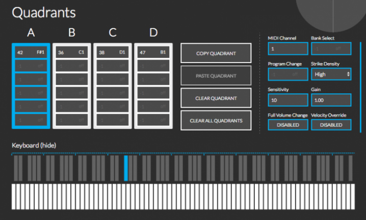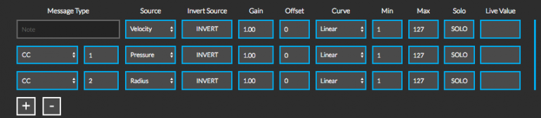 Los mensajes MIDI que pueden generarse a partir de estas variadas acciones incluyen, además de los de nota, los relativos a 'pitch bend', a cambios de controlador (CC), y a las dos versiones del 'aftertouch' posibles en MIDI (el 'de canal' y el 'polifónico') haciendo que podamos matizar cada golpe independientemente, ya sea por el uso de canales MIDI diferentes en cada cuadrante (al estilo de las premisas del estandar MPE) o bien con el uso de aftertouch polifónico (al que vía MIDI pueden responder casi todos los sintetizadores).