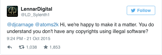 Lennar Digital es la segunda vez que entra al trapo con este tipo de asuntos; ya en febrero tuvo que publicar un comunicado en el que tras circular durante mucho tiempo en la red varios vídeos en los que se veía a los DJs y productores Steve Aoki, Avicii y Martin Garrix empleando versiones pirata de su sintetizador Sylenth1, la empresa aclaró que compraron licencias años antes de la aparición de los vídeos, aunque lamentaban que hubieran sido perezosos o descuidados e instalaran versiones pirata en sus ordenadores para realizar vídeos promocionales o tutoriales. Steve Aoki también dio explicaciones al respecto, diciendo que fue una metedura de pata de alguien de su equipo. Sin embargo esta vez Lennar Digital sí que se enfrenta de cara con quien ha sido pillado –¿habrán comprobado que no compró la licencia?–, aunque personalmente debo reconocer que no tengo claro que sea cierto que usar software pirata invalide la propiedad intelectual de lo creado con ese software.