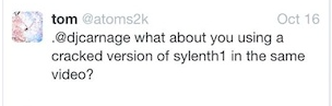 Entre las diversas críticas que cayeron por Twitter, surgió una de un desconocido pero avispado productor aficionado de Melbourne conocido como Atoms que se percató de que en el vídeo tutorial Carnage empleaba una versión pirata de Sylenth1, y no dudó en lanzarle desde Twitter una pequeña pulla a Carnage: ¿Qué hay de ti empleando una versión pirateada de Sylenth1 en el mismo vídeo?