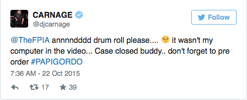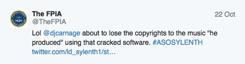 De todos modos, lo más inteligente en estos casos es no decir nada más, pero Carnage no fue capaz. La siguiente pulla vino de parte de The FPIA, unos chicos que medio en broma medio en serio, se dedican a difundir por la red información sobre casos de falsos productores: "Carnage a punto de perder los derechos de las canciones que "ha producido" usando ese software pirateado...", no sin cierta sorna al entrecomillar "ha producido".
