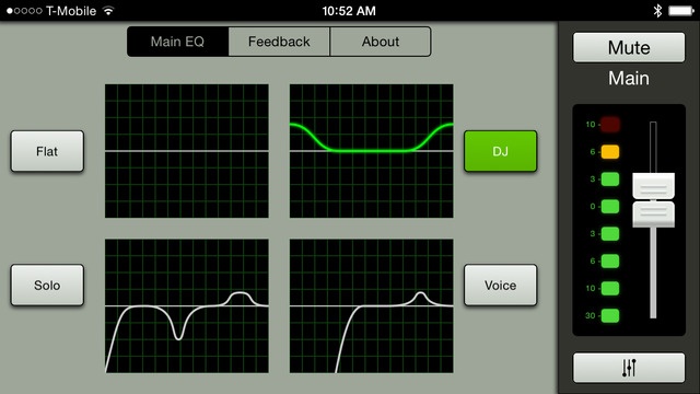 En cada una de esas tres entradas (dos mono y una estéreo) puede configurarse una EQ graves/medios/agudos (80Hz, 2.5KHz, 12 KHz) con excursión de +/-15dB en saltos de 3 dB. Existe además una EQ maestra con 4 respuestas preajustadas: plana, DJ, instrumento, y locución.