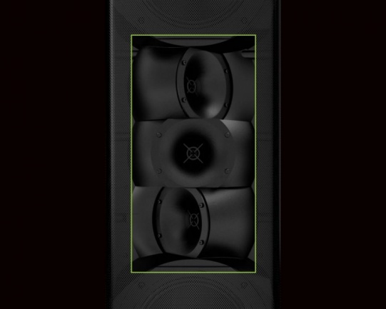 De ellos 260W están concebidos hacia el público y llegan a los 150º de abertura. El sistema hacia la audiencia usa dos conos de graves de 6,5" con amplificación independiente (2 x 100W) enfocados hacia el frente, mientras los tres tweeters de 1" enfocan en abanico y usan un ampli compartido de 60 W (tecnología Amplified Radial Curve, ARC, en términos de Mackie).