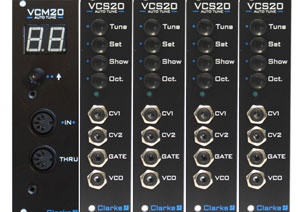 Vince Clarke se asocia a Analogue Solutions y abre con estas referencias un apartado de 'circuitos' en su actividad. Cada VCM-20 (con 'M' de Master, y VC de... ya os lo imagináis) puede controlar hasta 16 VCS-20 ('S' de Slave). Cada VCS-20 a su vez puede estar al tanto de un VCO. Cuenta con dos salidas CV, una asociada a los mensajes de nota y la otra a la información de velocidad de las notas MIDI. La salida Gate llega a los 11V y puede ser configurada en V-trig o en S-trig.