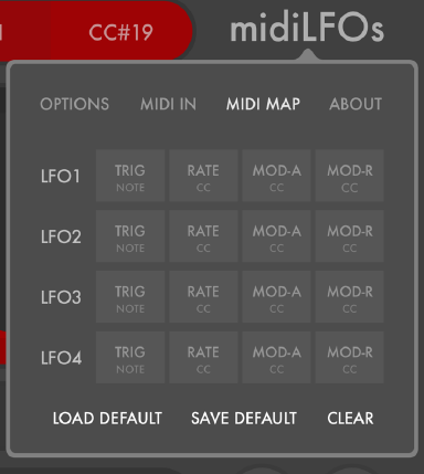 Es factible también el uso de información MIDI para controlar varios parámetros de los LFOs, a través de los ajustes 'Map MIDI'. En particular, el disparo de un LFO es factible desde mensajes de nota, lo que unido a la posibilidad de funcionamiento en disparo único, permite que los LFOs actúen para marcar efectos transitorios en el arranque de notas.