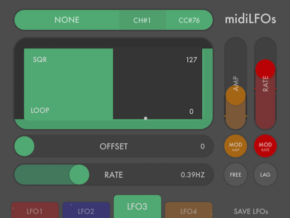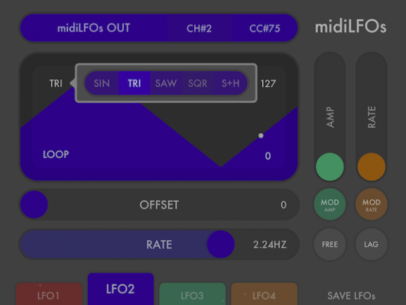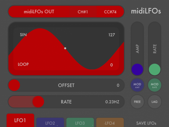 Tras haber estado envuelto en la creación de aplicaciones para iOS como FunkBox o Little MIDI Machine, Arthur Kerns abre web propia y lo hace con una primera app llamada midiLFOs (5€ en AppStore). Una utilidad sencilla pero bien organizada, midiLFOs cuenta con 4 LFOs configurables que pueden generar mensajes MIDI CC hacia cualquier interfaz o aplicación Core MIDI visible desde el dispositivo iOS.