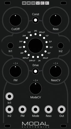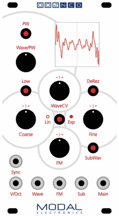El ‘oscilador controlado numéricamente’ (léase digital pretendidamente avanzado) de Modal ofrece un conjunto de 50 formas de onda súper estables (visibles en una minipantalla) y un suboscilador. Cuenta con entrada sync, y dos CVs (FM y selección de onda que dobla como control PWM si activamos la onda cuadrada). Hay salida independiente de la onda principal y la del suboscilador (que puede ser cuadrada o bien idéntica a la principal una octava por debajo). Puede funcionar en bajas frecuencias para uso como LFO, o sufrir un downsampling forzado con el control ‘DeRez’ para introducir las dosis deseadas de aliasing. 14HP.