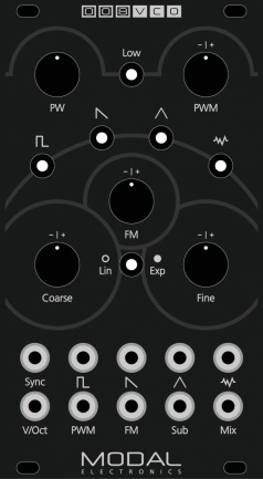 Se trata del oscilador analógico de Modal, con diente/triang/pulso/ruido y con control de la anchura para el pulso, además de suboscilador, pudiendo combinar mezclándolas todas esas formas de onda en su salida Mix o bien usarlas en salidas individuales. Con entradas sync, FM y PWM, y posible uso como LFO. 14HP.
