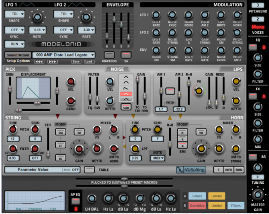 Modelonia combina modelos de tipo cuerda pulsada con excitación impulsiva, y modelos de tipo viento/metal con excitación continua. Además de los parámetros abundantes para cada modelo, cuenta con una curiosa posibilidad de combinar simultáneamente ambos modelos e incluso realizar un cierto 'cruce' entre ellos. Distinguiréis fácilmente en su interfaz los controles específicos de uno y otro modelo, coloreados con el rojo/madera para cuerdas y con el dorado para viento metal.