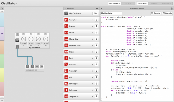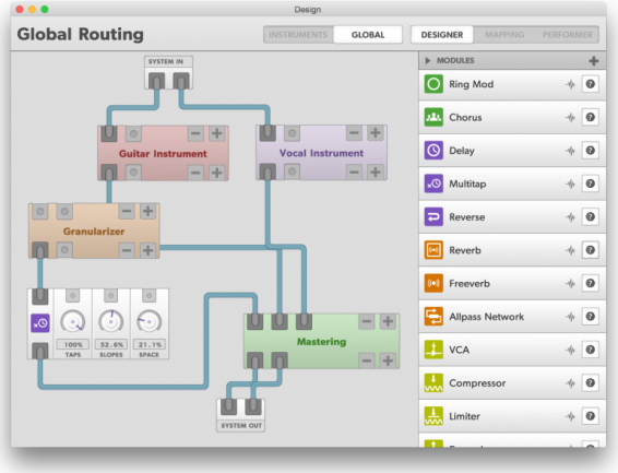 Esos módulos e instrumentos pueden ser tanto generadores como procesadores de las señales que reciben, y pueden interconectarse entre sí, con otros módulos y por supuesto con entradas y salidas audio, MIDI y OSC, además de posibilidad de usar el sensor Leap Motion.
