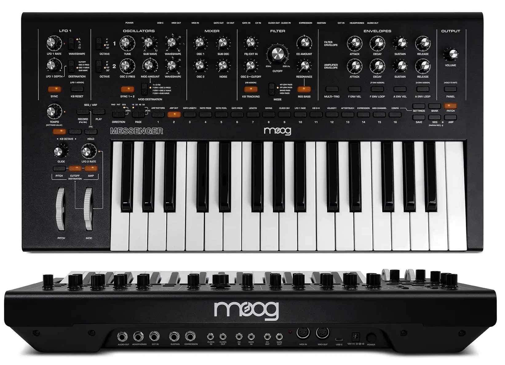 También se aprecia un LFO principal con varios parámetros y un segundo más limitado que puede verse en la zona de la rueda de modulación, así como arpegiador y secuenciador que alcanza los 64 pasos. Y es de suponer que ya sería fabricado en Taiwan, en vez de en Asheville.