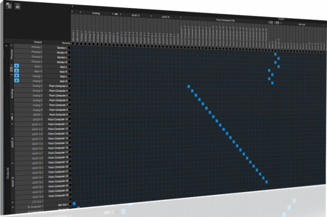 La matriz de rutado usa una cuadrícula entrada/salida para realizar el mapeo que podamos requerir, encaminando cualquier entrada o mezcla hacia cualquier salida, incluyendo la posibilidad de rutado múltiple hacia varias. Los retornos audio del ordenador o cualquier dispositivo audio presente en la red AVB puede ser atendido en esta matriz.