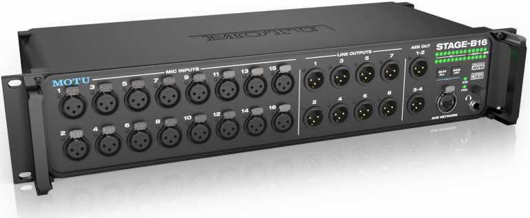 Junto con UltraLite AVB, otra de las novedades de MOTU esperadas para este 2015 es la que acaba de comenzar a comercializarse. Stage-B16 (1700 USD) permite capturar 16 señales a través de sendas entradas de micro y previos, ofrece un mezclador y procesador basado en DSP con capacidad de 48 canales, y conectividad AVB sobre Ethernet o bien vía USB 2.0.