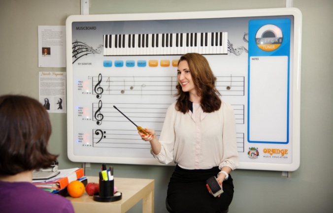 Curiosa propuesta, y más en la mano de Orange. Una pizarra pensada para el aula de teoría musical, que incluye un teclado de verdad dispuesto en forma tal que hasta los alumnos de la última fila vean la ejecución sobre él del profesor.