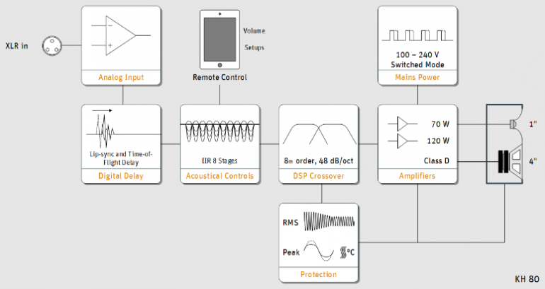 El KH 80 DSP es el primero en incorporar tecnología DSP a su catálogo. Se trata de un compacto monitor de campo cercano de dos vías con bi-amplificación en clase D (50 y 90 W @ 0.1% THD+N, que suben a 70 y 120 al 10% THD+N) y altavoces de 4 y 1 pulgadas con ancho de banda 57Hz-21kHz @ +/-3dB. Características notables que son posibles gracias al uso de un DSP interno que le permite obtener una respuesta muy equilibrada y extensa para su pequeño tamaño. Otras figuras como el ruido y el SPL a un metro, los patrones de radiación horizontal y vertical, o todo tipo de figuras en detalle sobre su respuesta los podéis encontrar en su página web y apuntan buenas maneras.