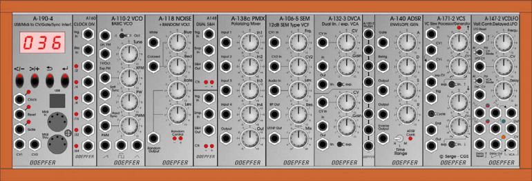 Incluye un módulo de interfaz MIDI/USB con capacidad para CV/Gate y Sync (A-190-4), el A-160 Clock Divider (ojo: no es el nuevo A-160-2), A-110-2 Basic VCO, A-118 Noise/Random, A-148 S&H/T&H (sample&hold), A-138c Polarizing mixer, A-106-5 SEM VCF, A-132-2 (un VCA doble y lineal/exponencial), A-180-2 Multiples (2x4), A-140 (un ADSR), A-171-2 VC Slew Limiter/Generator y A-147-2 VCDLFO.