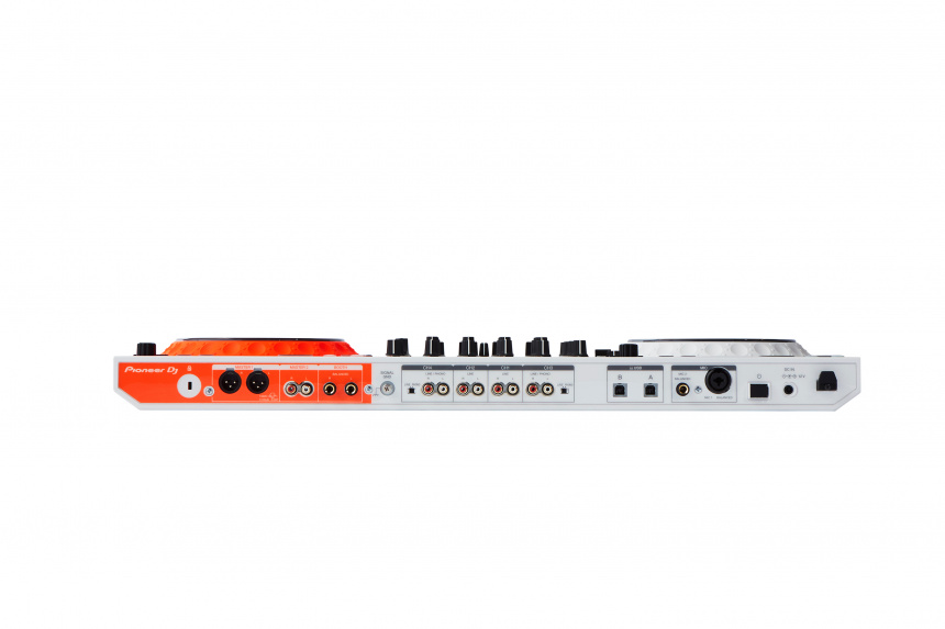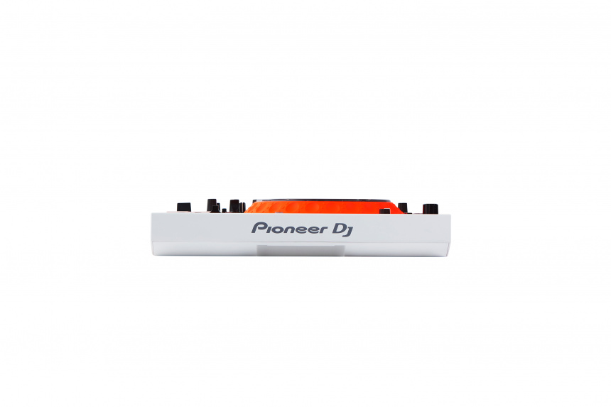Pioneer DDJ-1000-OW combina el blanco mate con el naranja fluorescente, y tal y como ya ocurrió con el diseño de la cabina Nexus, el dispositivo al ser traslúcido se ilumina con vivos colores en la oscuridad.