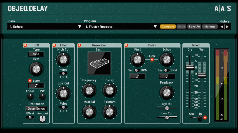 Como su nombre indica, se trata de un delay, pero siendo de AAS, no es cualquier tipo, sino un novedoso efecto basado en la idea de combinar filtros acústicos y funciones de modelado físico con los elementos hallados tradicionalmente en un delay, lo que le permite ir más allá de la mera repetición y el rebote para proponer otro tipo de sonidos y funciones de moldeado de los mismos.