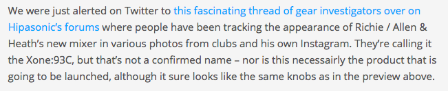 Dado que la marca Allen&Heath ha estado renovando los dos pasados años su línea de mixers analógicos con los modelos Xone:23, Xone:23C, Xone:43 y Xone:43C –la “C” en el nombre indica que monta internamente un interfaz de audio USB multicanal– mucha gente comenzó a pensar que Hawtin estaba asesorando de alguna manera a Allen&Heath en el desarrollo del mixer que sucedería al Xone:92, y que muy probablemente se encarnara bajo los nombres Xone:93 o Xone:93C. Tanto las fotos que Hawtin ha publicado en redes sociales como las tomadas por asistentes en algunos eventos –hay quien piensa que el equipo de Hawtin en realidad controla todas las fotos– han sido escudriñadas hasta la saciedad tanto por los seguidores del artista canadiense como por los amantes de la tecnología musical de directo en busca de descifrar el layout del mixer, sus posibles características y funciones, así como confirmar el hecho de que el aparato proviene de la firma Allen&Heath. Cierto parecido con el mixer Xone:92 observado en las fotos, daba fuerza a estas teorías: seis canales, distribución similar de los elementos, vúmetros similares...