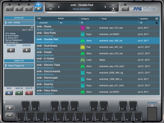El control de tan amplia estructura de posibilidades cuenta con nada menos que 10 envolventes y 4 LFOs, más una matriz de modulación extensa en la que intervienen tanto las señales de control de esas envolventes y LFOs, como controles MIDI y una nutrida colección de controles táctiles sobre iPad que ofrece en sus distintas pantallas Infinite.