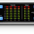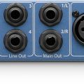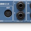 Studio 26 es una interfaz de 2x4 con dos entradas de micro en combo XLR 1/4" en panel frontal y alimentación phantom de 48V. Cuenta con dos salidas principales 1/4" balanceadas, además de dos salidas balanceadas de línea para monitoreo. Dispone de entrada y salida MIDI, medidores LED con visualización de niveles de entrada y salida, y función Cue Mix A/B para monitorear entre dos mezclas mediante cascos.