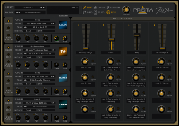 Prisma permite configuraciones dedicadas para hasta cuatro instrumentos, ofreciendo control individual de velocidad, rango, distribución en el teclado, control de presets. etc. Además dispone de una sección de “multi-control” para combinar patches de varias formas a partir de un sistema dedicado de integración y generación de macros, esto es, controles globales que permiten asignar múltiples parámetros de los instrumentos, a los controles de Prisma, ubicando sonidos en capas y además pudiendo alterarlos mediante efectos integrados.