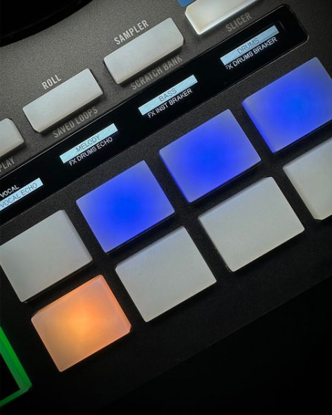 Por otro lado, se observan los típicos pads para el Pad Mode: Roll, Sampler, Saved Loops, Scratch Bank y Slicer. Y finalmente en el extremo izquierdo de la foto es visible un botón cuadrado con el borde verde que se parece mucho al que actualmente Rane monta en sus controladores One.