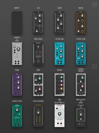 En total se ofrecen 15 sub-módulos y se promete que haya más disponibles pronto. Hasta ahora se incluye: LFO, ADSR, ruido, Sample & Hold, modulador en anillo, filtro 6dB y filtro 12dB, tono, amp, mezcla, mezcla estéreo, control de curva, divisor de gate, tiempo de delay del trigger al cv, y clock midi a gate.
