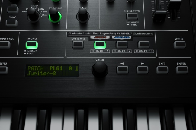 - Junto a él pueden alojarse 3 plug-outs que crean nuevos sintes bajo el mismo hardware. Los correspondientes a Jupiter-8 y Juno-106 incluidos en la compra (J-106 se entregará sin coste en primavera de 2017). Otros plug-out ya conocidos en System-1 y nuevos irán apareciendo también disponibles para System-8.