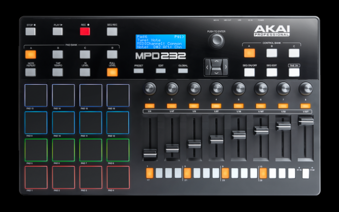 - MPD232 – Cuenta con 16 pads, 8 faders, 8 potenciometros y 8 botones, todos asignables en 4 bancos diferentes. Además incluye una novedad importante respecto al anterior MPD32: un nuevo secuenciador con 64 partes y 32 pasos que permite controlar eventos de los pads.