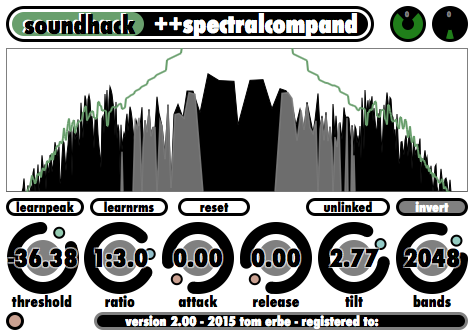 - ++spectralcompand es en teoría un compresor/expansor, por tanto puede utilizarse para realzar levemente de señal o corrección de ruido, pero además cambios extremos de timbre, al poder filtrar determinadas frecuencias desde la misma gráfica espectral