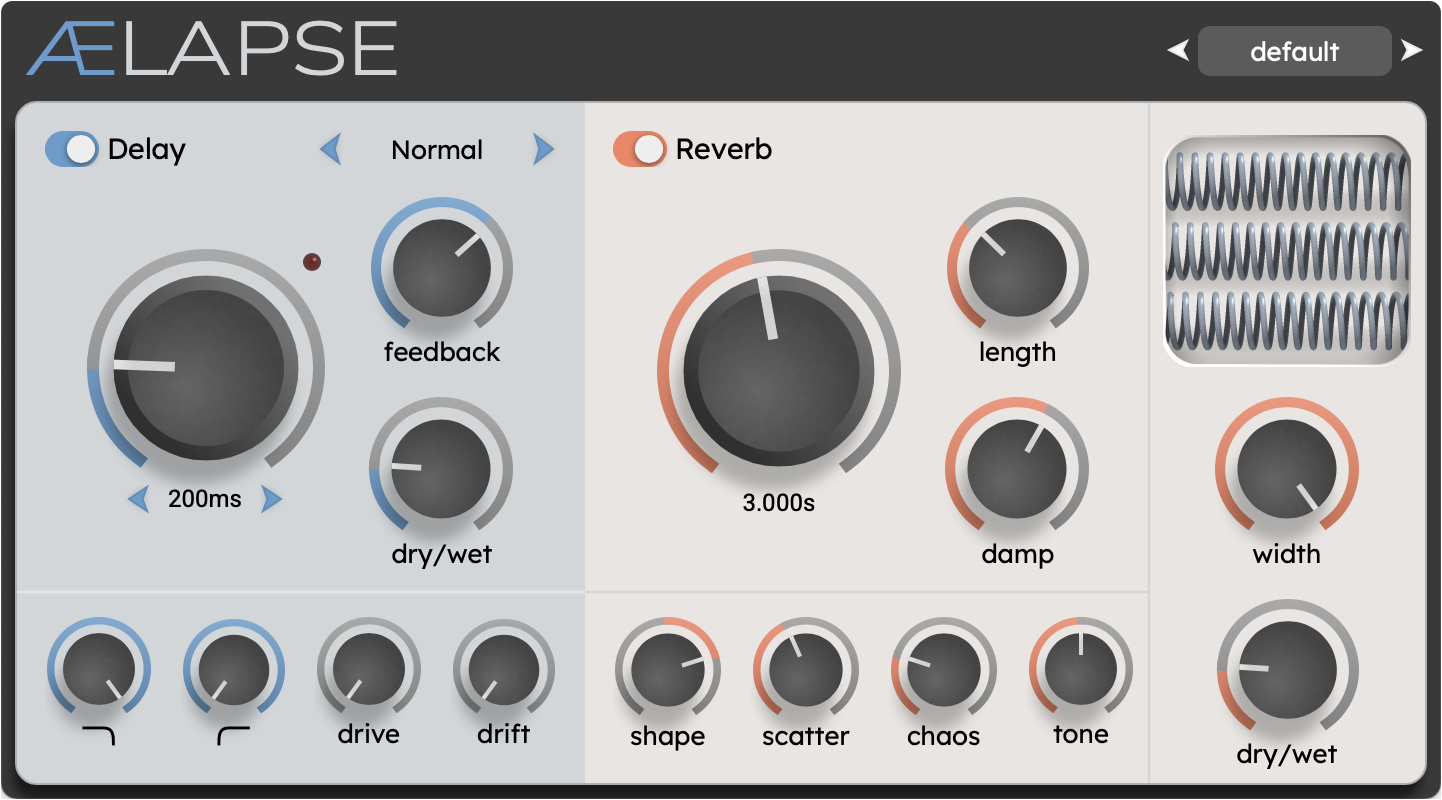 ÆLAPSE es un procesador que combina un delay de cinta con una reverb de muelles, dos efectos clásicos que aquí se presentan con un enfoque moderno y flexible. El plugin ofrece un delay estéreo con controles de tiempo, feedback, mezcla, saturación y filtro, además de un selector de sincronización al tempo del DAW. El carácter del delay está inspirado en unidades de cinta retro, con la posibilidad de introducir modulación para generar variaciones sutiles o efectos más pronunciados.